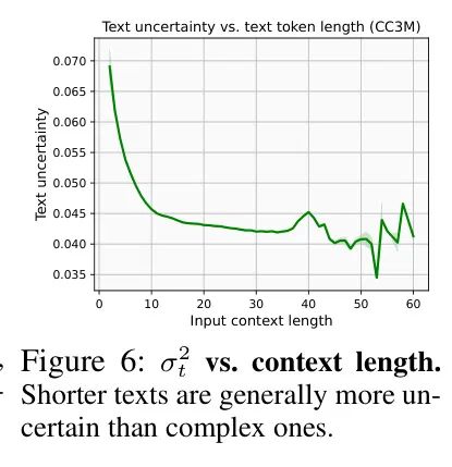 什么导致了不确定性?作者通过分析文本上下文长度和数据层次来回答这个问题。首先,作者在ConceptualCaption 3M(CC3M)的描述中绘制文本不确定性(Sharma等人,2018)。如图6所示,较短的描述通常具有较大的不确定性值。例如,作者发现CC3M中描述不确定性最大的是“ 电影系列 ”,而最确定的描述是“匪帮说唱歌手,由人@人我差点死里逃生,你必须看一看!”。也就是说,不确定性更大的描述往往更具逻辑上的普遍性,如“连衣裙 - 缝纫图案”或“人 - 前后对比”,而确定性更大的描述则指定了一个具体情境。