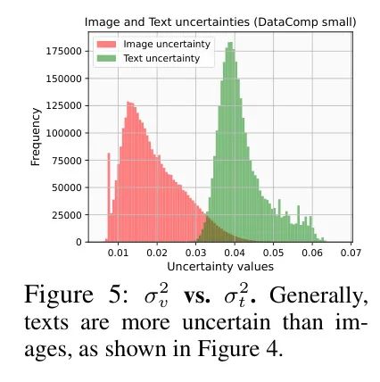 统计σv^2和σt^2。在图4中,作者还观察到σv^2通常小于σt^2,这可能源于方程(6)中的包含损失 。图5显示,图像嵌入和文本嵌入具有不同的不确定性值,正如作者所料。