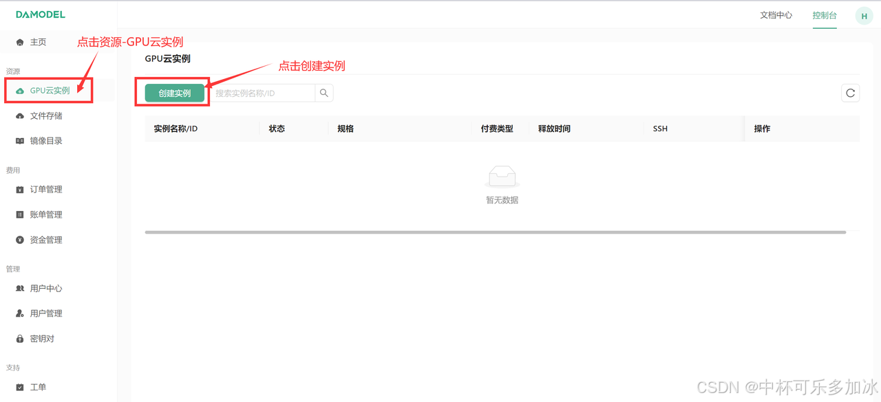 本次实验选择了DAMODEL(丹摩智算)平台,致力于提供丰富的算力资源与基础设施助力AI应用的开发、训练、部署。首先进入控制台,,点击资源-GPU云实例,点击创建实例: