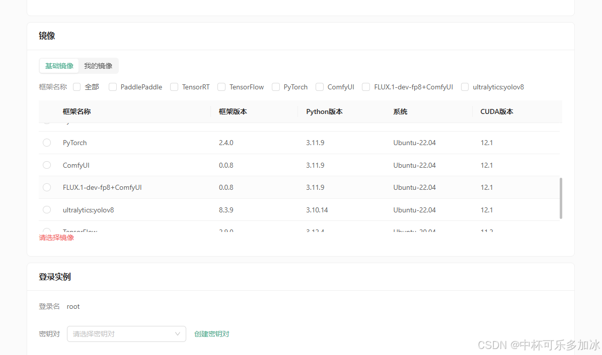 继续往下翻,配置数据硬盘的大小,每个实例默认附带了50GB的数据硬盘,本次创建可以就选择默认大小50GB,可以看到,平台提供了一些基础镜像供快速启动,镜像中安装了对应的基础环境和框架,这里选择PyTorch镜像启动。除此之外,平台还提供了ComfyUI、FLUX.1-dev-fp8+ComfyUI、yolov8