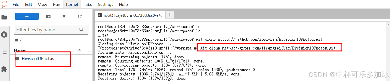 首先输入git clone,将仓库代码克隆到本地,这里连接github可能偶尔不稳定,可以克隆gitee的仓库,两者内容相同: