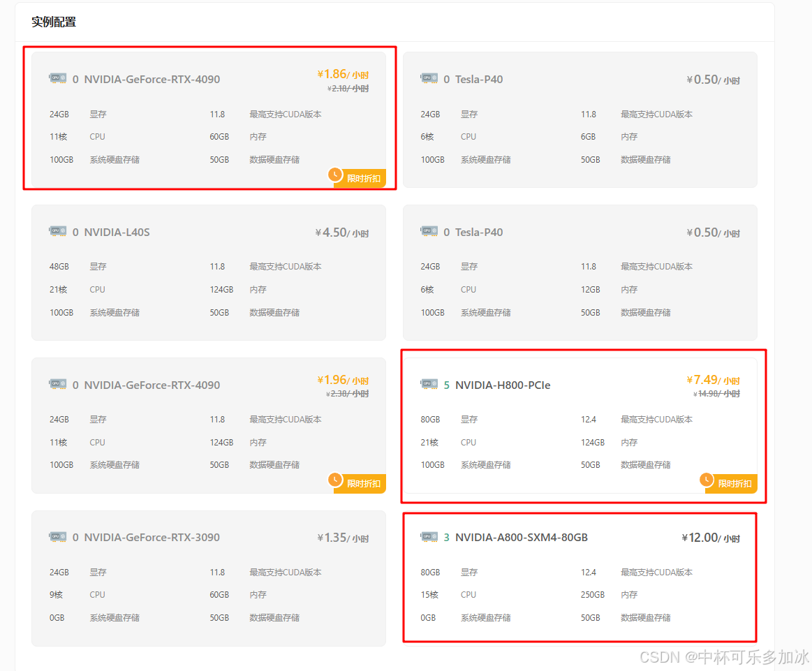 进入创建页面后,首先在实例配置中首先选择付费类型为按量付费,其次选择单卡启动,然后选择需求的GPU型号,本次实验可以选择选择NVIDIA-GeForc-RTX-4090或者Tesla-P40显卡。