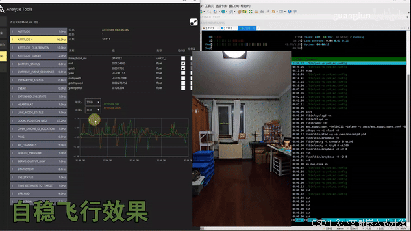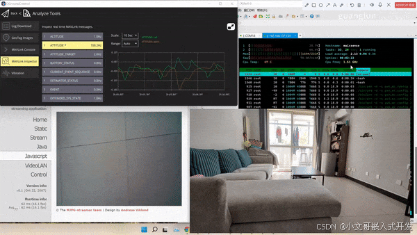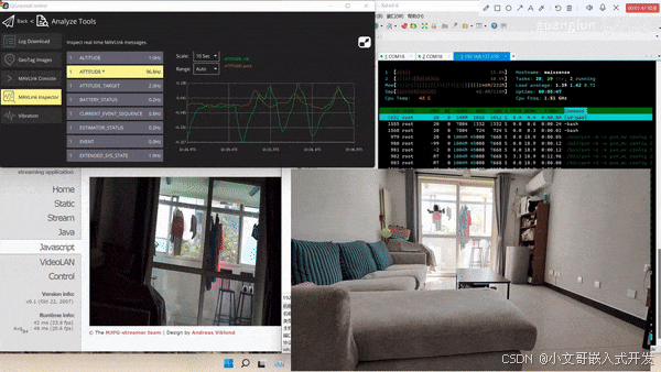 如下图中的画面所示,左侧是飞控通过WiFi与QGC连接后将无人机姿态数据返回的显示界面,右侧的画面则是T113芯片的负载情况显示,T113是双核处理器,作者这里只把T113的核心1做了隔离,只运行PX4程序,所以可以通过核心1的反馈直接看运行PX4程序的负载情况,核心0是负责系统上的其他程序运行。