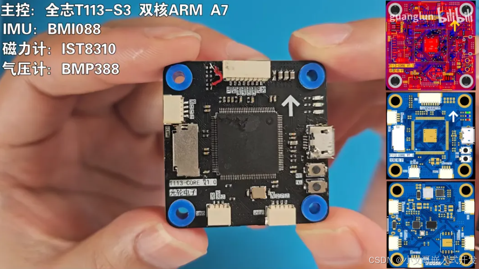 基于此,作者就基于全志T113-S3设计了一款仅有30x30孔距的超轻量无人机飞控,可以实现无人机的自稳飞行及远距离图传。