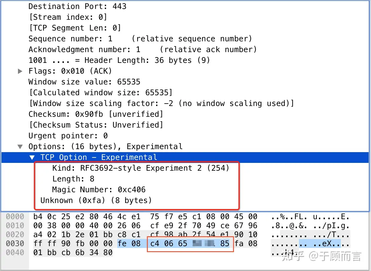 这样以来,业务四层端口接入后,节点和源站经过三次握手,在最后一个ACK数据包的TCP Option中插入了源端口号和源IP等信息,共占8个字节。