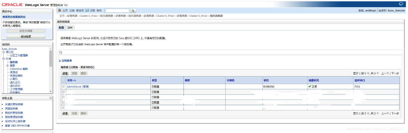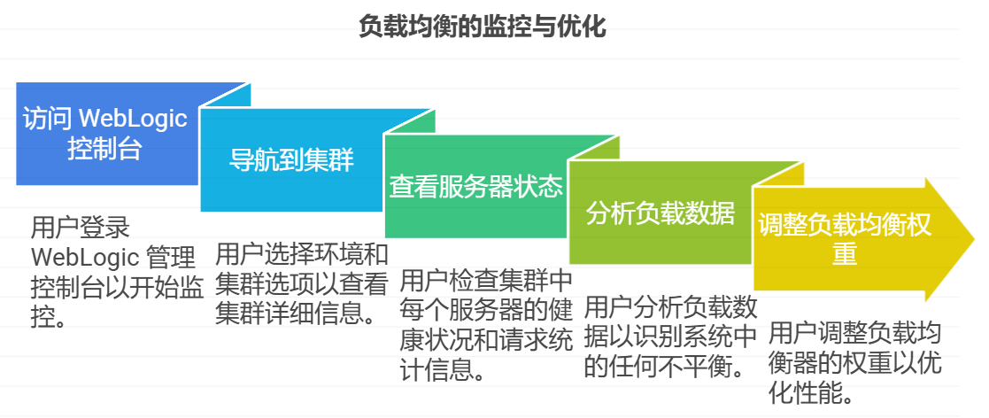 通过 WebLogic 管理控制台,可以查看集群中每个服务器的状态,包括负载情况、处理的请求数等。可以通过以下步骤监控负载均衡器: