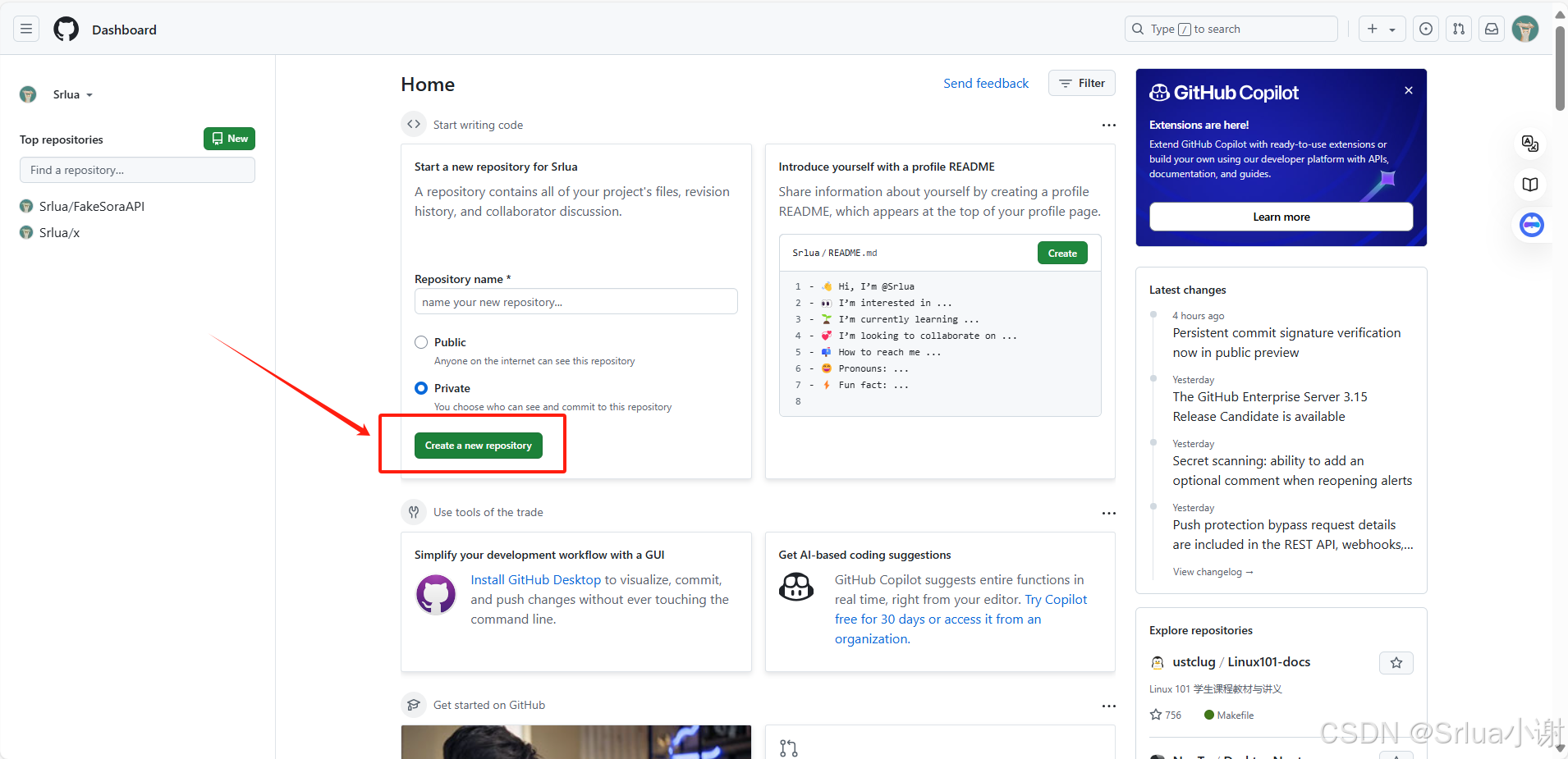 1. 登陆成功后, 进入个人主页, 点击左下方的 New repository 按钮新建项目