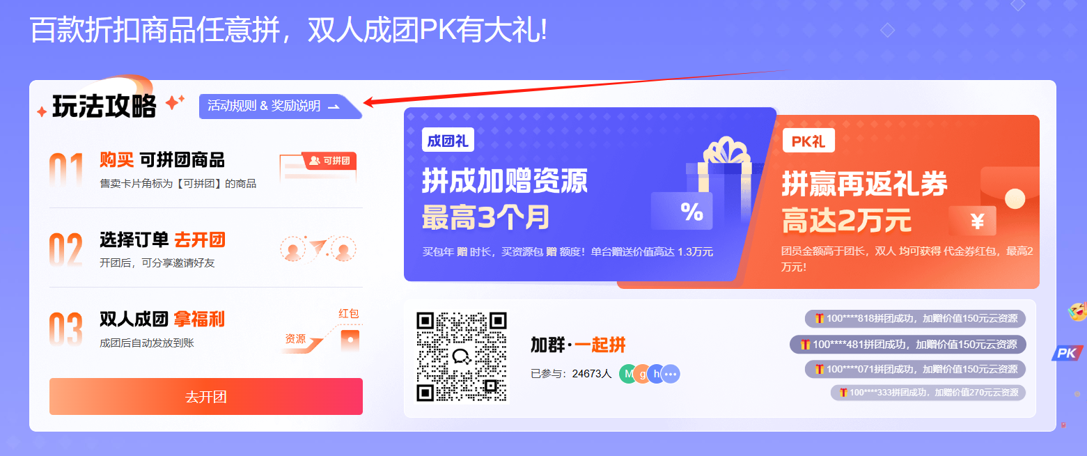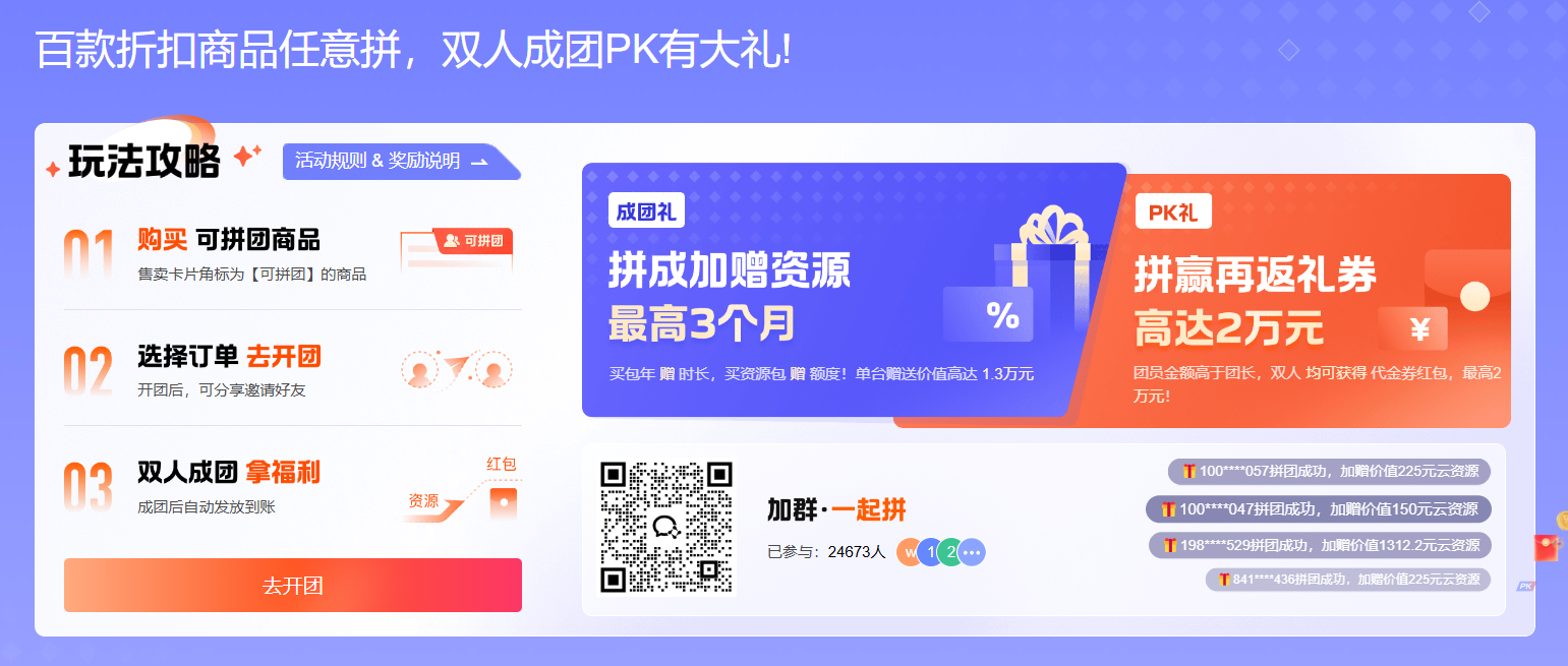 先说成团礼,只要拼团成功就送,门槛低,你买什么我送什么,直接送时长,送额度,绝不是忽悠,刚需用户/企业的不二之选