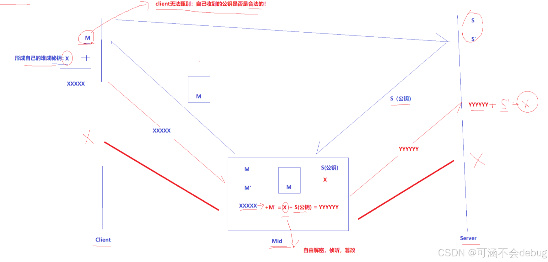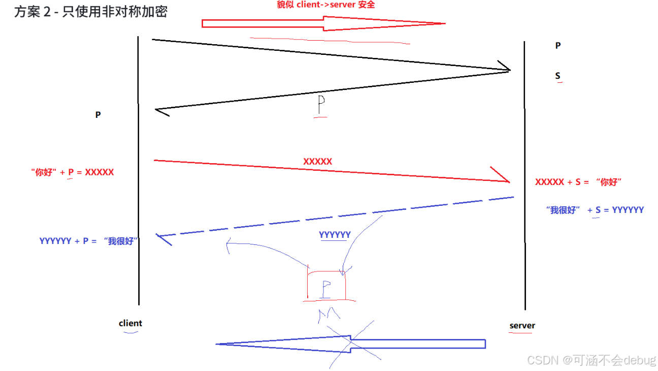 确实,在方案 2/3/4 中,客户端获取到公钥 S 之后,对客户端形成的对称秘钥 X 用服务端给客户端的公钥 S 进行加密,中间人即使窃取到了数据,此时中间人确实无法解出客户端形成的密钥 X,因为只有服务器有私钥 S'。 但是中间人的攻击,如果在最开始握手协商的时候就进行中间人攻击了,那就不一定了,假设hacker 已经成功成为中间人了呢?!