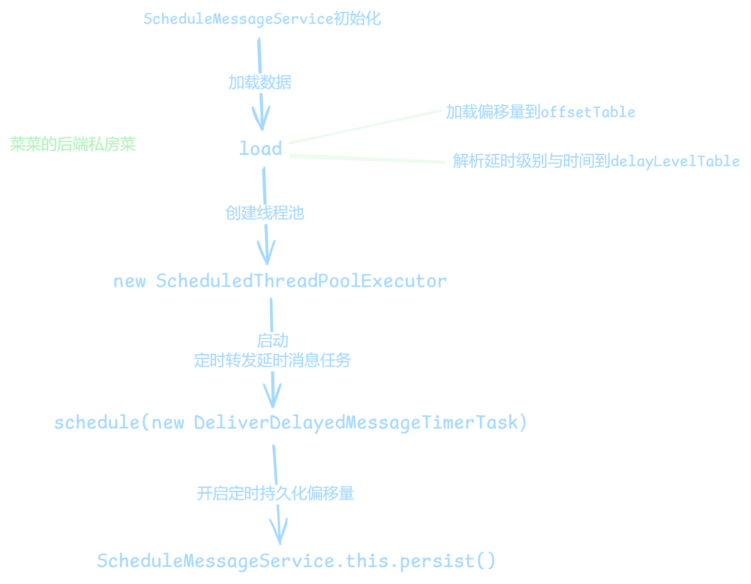 组件ScheduleMessageService用于处理延时消息,初始化的步骤: