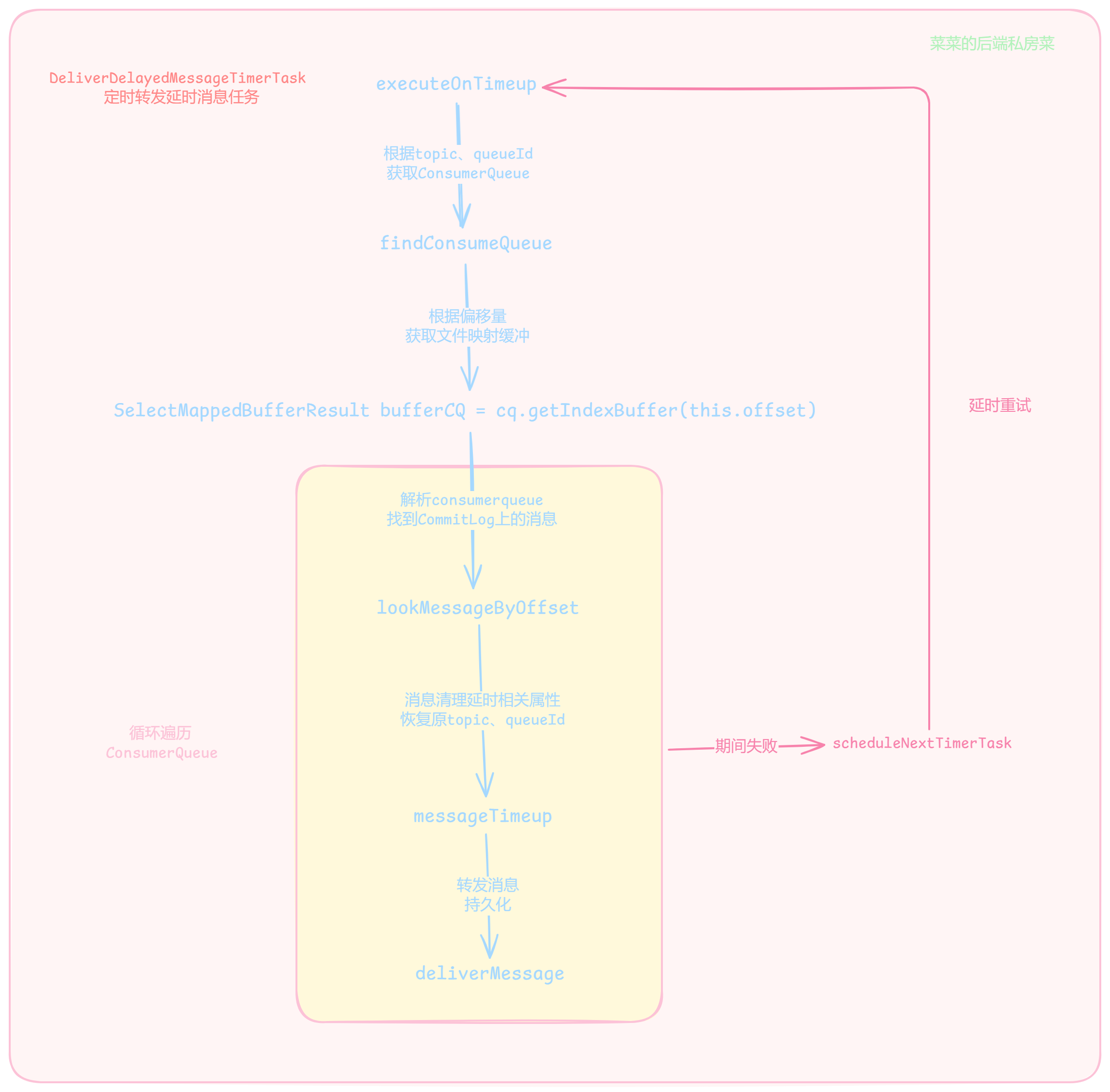 DeliverDelayedMessageTimerTask任务用于定时转发延时消息,会判断当前队列的消息是否过期,如果过期会将消息重投到原topic、队列中,否则延时重试