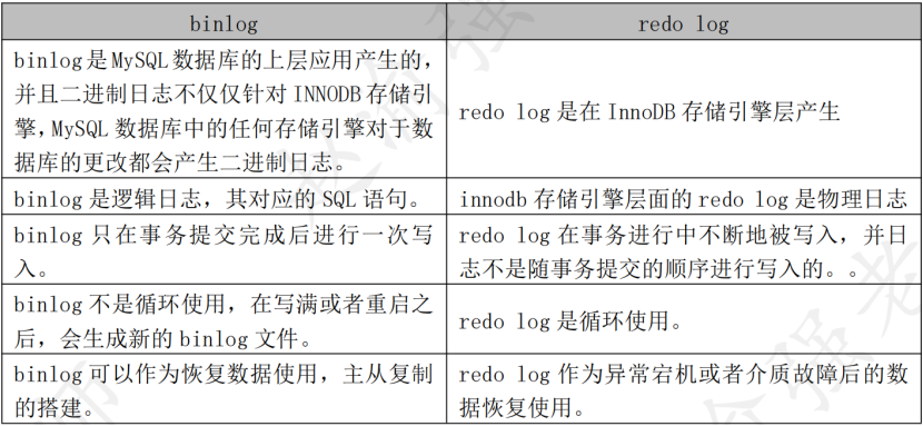 与binlog非常相似的一个概念叫做redo log,下表列出了二者的区别。