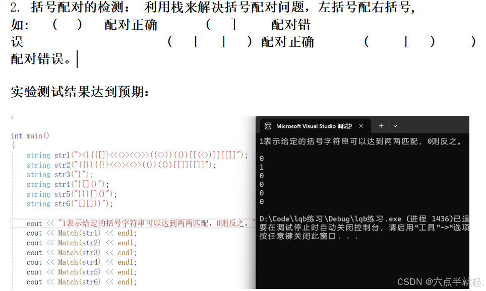 2.括号配对的检测: 利用栈来解决括号配对问题,左括号配右括号, 如: ( ) 配对正确 ( ] 配对错误 ( [ ] ) 配对正确 ( [ ) ) 配对错误。