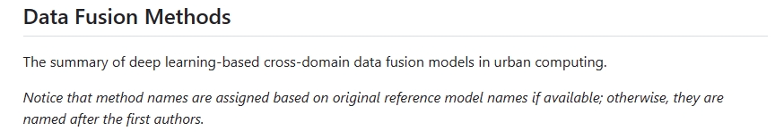 城市计算中基于深度学习的跨域数据融合模型的总结。(方法名称将基于原始引用模型名称进行分配;否则,它们将以第一作者的名字命名。)