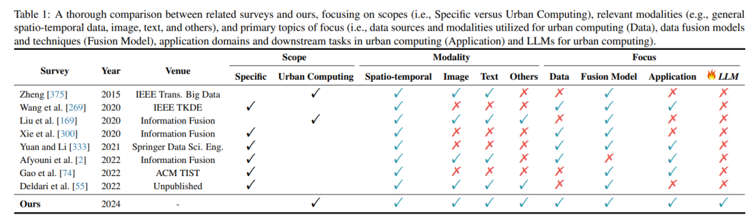 数据视角的分析 :对城市计算中使用的不同类型的数据源和模态进行了分类和讨论。融合方法的分类 :将现有的数据融合方法分为四类,并提供了每种方法的详细描述和应用实例。应用领域的分类 :将城市计算的应用分为七个主要领域,并探讨了深度学习在这些领域中的应用。数据集的编译 :提供了一个关于城市计算中常用数据集的全面列表,包括它们的来源、时间覆盖范围和空间分布特征。未来研究方向的提出 :基于当前研究的局限性和挑战,提出了未来研究的潜在方向。LLMs与城市计算的结合 :探讨了大型语言模型(LLMs)在城市计算中的应用前景。由于这项工作的性质是文献综述,所以没有包含实验部分。相反,作者通过分析现有的研究工作来建立一个全面的理论框架,并为未来的实证研究提供指导。