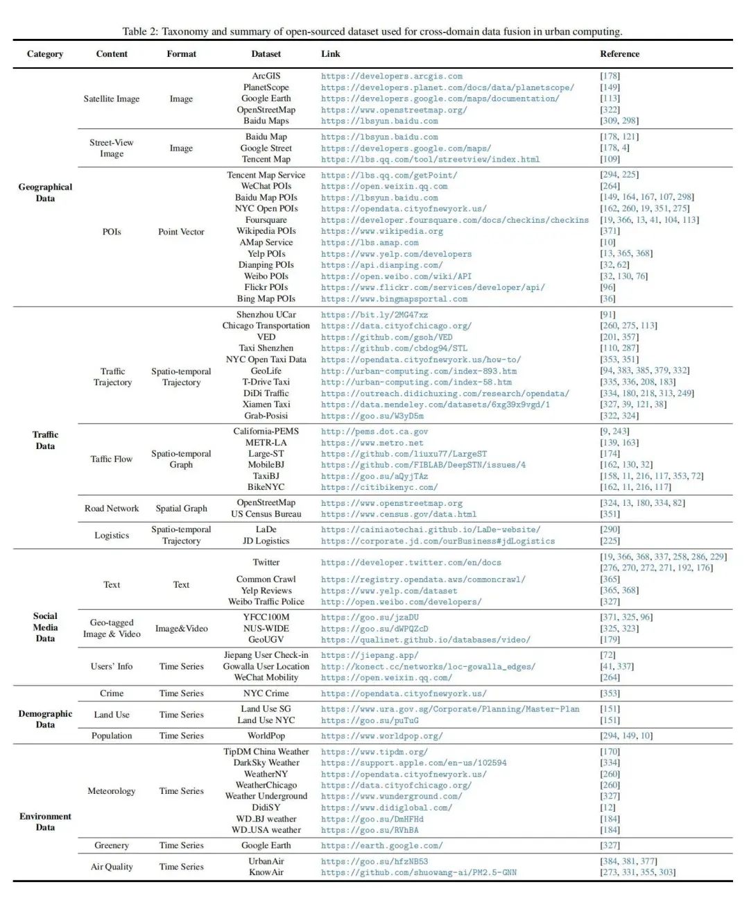 地理数据(Geographical Data)卫星图像(Satellite Image):图像 街道图像(Street View Image):图像 POIs(兴趣点):点向量(Point Vector) 交通数据(Traffic Data)交通轨迹(Traffic Trajectory):时空轨迹 交通流(Traffic Flow):时空图 路网(Road Network):时空图 物流(Logistics):时空轨迹 社交网络数据(Social Network)文本(Text):文本 地理标记的图像和视频(Geo-tagged Image&Video):图像和视频 用户信息(Users' Info):时间序列 人口统计数据(Demographic Data)犯罪(Crime):时间序列 土地利用(Land Use):时间序列 人口(Population):时序 环境数据(Environmental Data)气象(Meteorology):时间序列 绿化(Greenery):时间序列 空气质量(Air Quality):时间序列 强相关论文列表 按照国内外城市计算实验室 总结