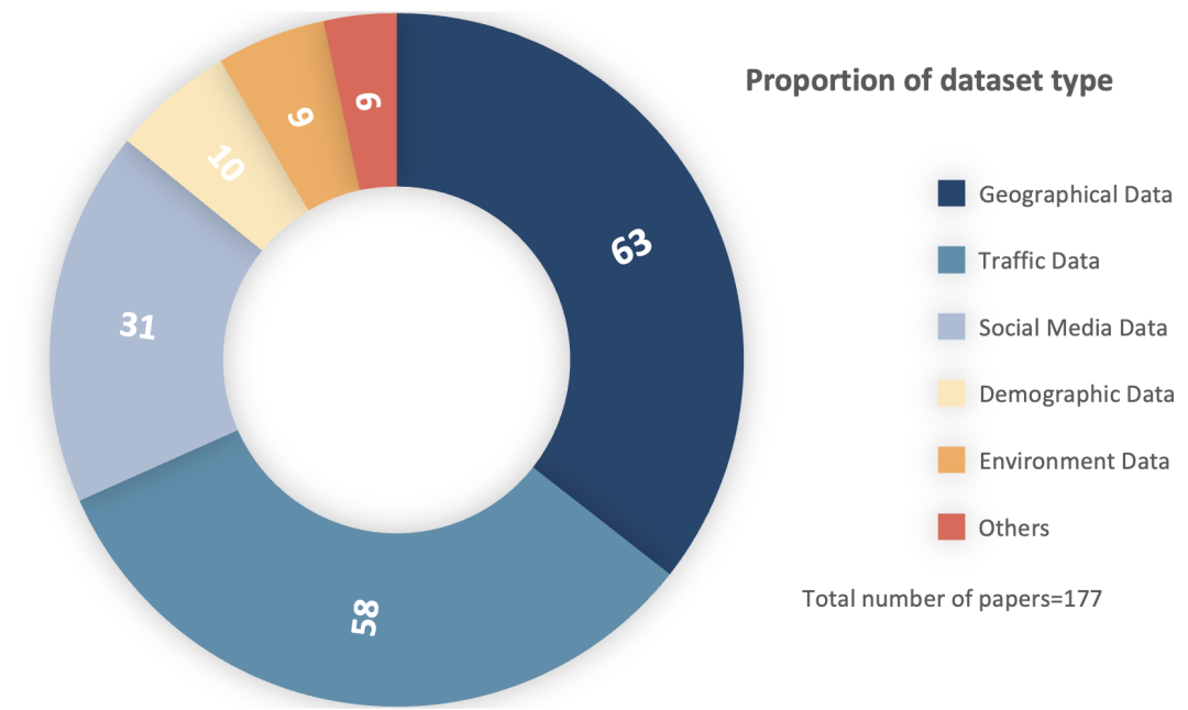 城市计算跨域数据融合范围内强相关论文中数据集类型的比例。