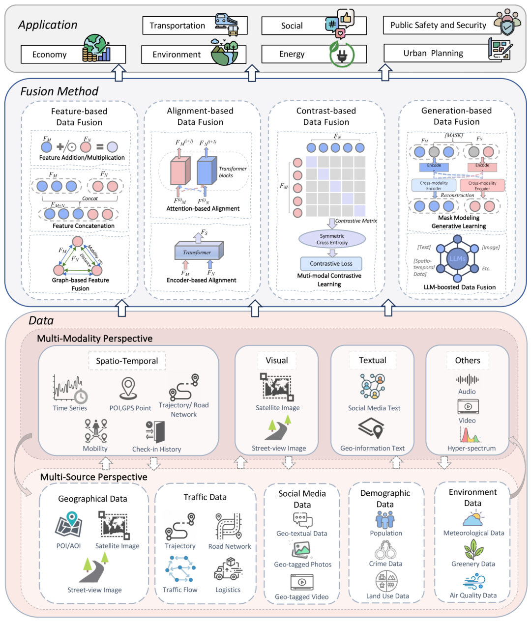 综述中的城市计算中基于深度学习的跨域数据融合的分类框架。该框架自下而上围绕三个维度构建:数据、融合方法和应用。在每个视角中,将现有研究分为不同类别,以提供全面且组织良好的回顾。