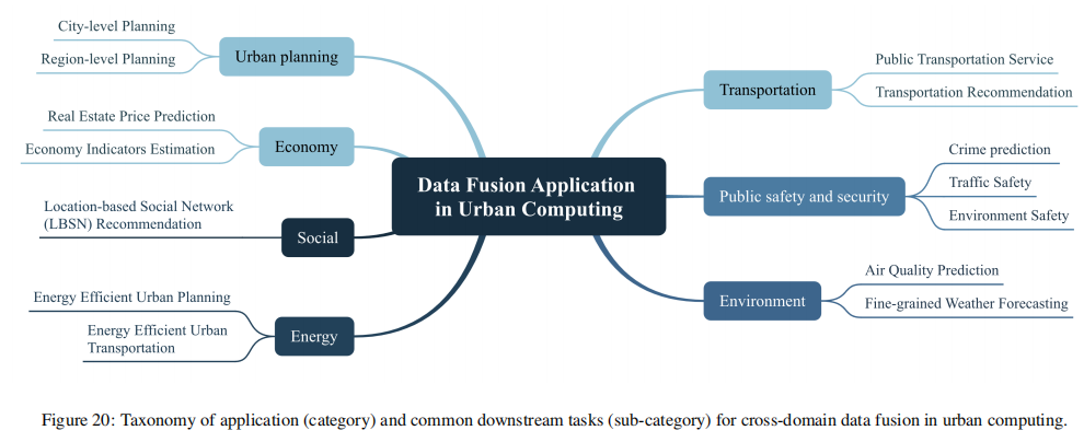 应用领域的分类 城市规划:城市级别(City),区域级别(Region) 经济:房地产价格预测,经济指标估计 社交:基于位置的社交网络(LSBN)推荐 能源:节能城市规划,节能城市交通 交通:公共交通服务,交通推荐 公共安全:犯罪预测,交通安全,环境安全 环境:空气质量预测,细粒度天气预报 城市计算中跨域数据融合的应用(类别)和常见下游任务(子类别)的分类