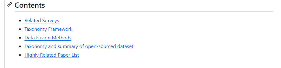 相关综述 分类框架 数据融合方法 开源数据集的分类总结 强相关的论文列表 项目内容