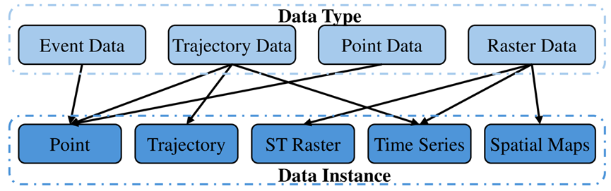时空数据结合了空间和时间的元素,可以揭示跨越时空现象的见解,广泛应用于环境监测、交通分析、流行病学、社会科学和城市规划等领域。这些数据通过地理坐标和时间戳表示,便于分析模式、趋势和关系。时空数据可以分为事件(event)数据、轨迹(trajectory)数据、点(point)数据和栅格(raster)数据四类。
