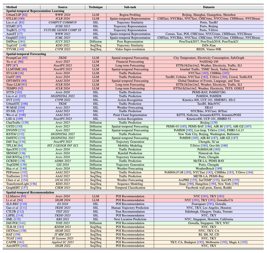 包括时空表示学习、时空预测和时空推荐。本文提供了详细信息,包括期刊/会议名称、使用的具体生成技术、涉及的特定应用子任务以及用于评估的数据集。