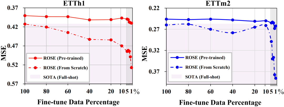 进一步观察ROSE在不同fine-tune比例下的表现,可以发现多领域数据的预训练赋予了ROSE出色的泛化能力,且仅需少量fine-tune样本即可达到SOTA性能。