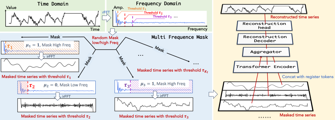 频率分解学习:时间序列数据由多个频率分量叠加而成,这使得不同时间变化相互重叠。低频成分通常包含整体趋势和较长周期的变化信息,而高频成分则多反映短期波动和较短周期的变化。因此,分别从低频和高频视角理解时间序列,有助于提升其通用表示学习效果。基于此,作者提出了多重频域掩码方法,按照不同的采样阈值,在频域中随机对时间序列进行低频或高频掩码处理,然后再将其转换回时域进行重构。
