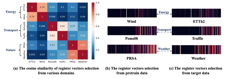通过可视化分析可以发现,同领域数据在时序寄存器中的相似度更高,这一现象在预训练数据和下游数据中都有所体现。
