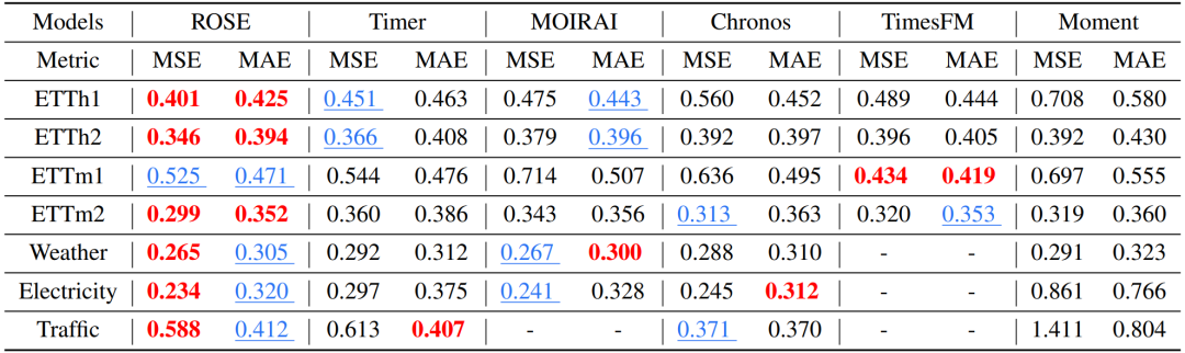 与其他时序预测基础模型在zero-shot设置下的对比中,ROSE也展现出了极具竞争力的表现。