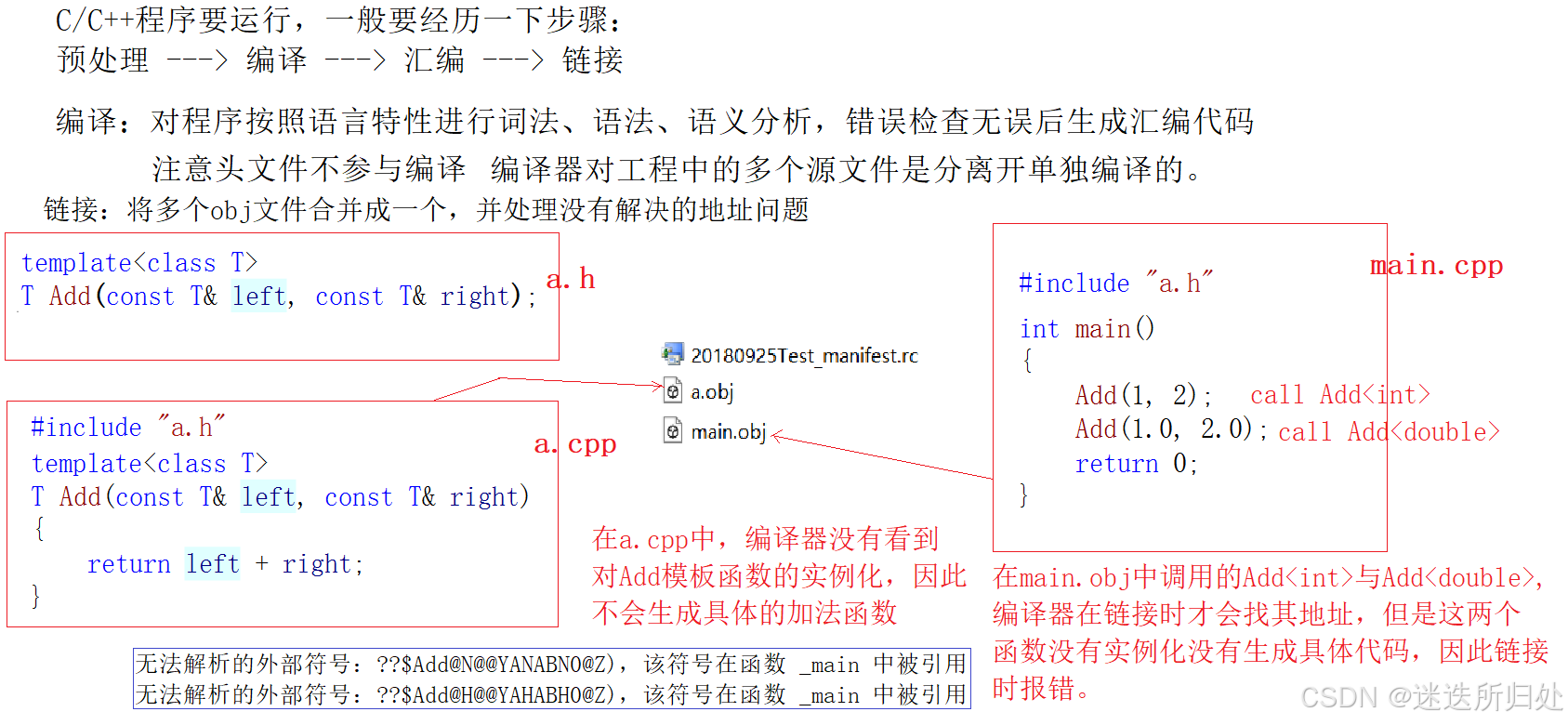 解决方法: 1. 直接把声明和定义在头文件(.h)里面定义模板,用的地方直接有定义,直接实例化 推荐使用 2. 模板定义的位置显式实例化 不推荐使用