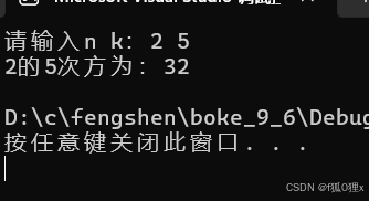 printf("%d的%d次方为:%d\n", n, k, ret);