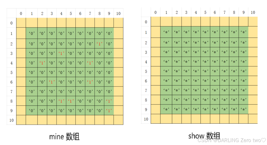 这里我们采用另外⼀种方案,我们专门给⼀个棋盘(对应一个数组mine)存放布置好的雷的信息,再 给另外一个棋盘(对应另外一个数组show)存放排查出的雷的信息,这样就互不干扰了,把雷布置到 mine数组,在mine数组中排查雷,排查出的数据存放在show数组,并且打印show数组的信息给后期 排查参考