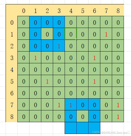 假设我们排查(5,8)这个坐标,访问周围一圈8个蓝色的位置,最下面三个坐标会越界