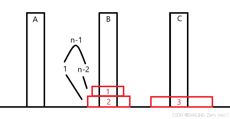 再接着把1盘挪到A柱 即1盘为n-2个盘子
