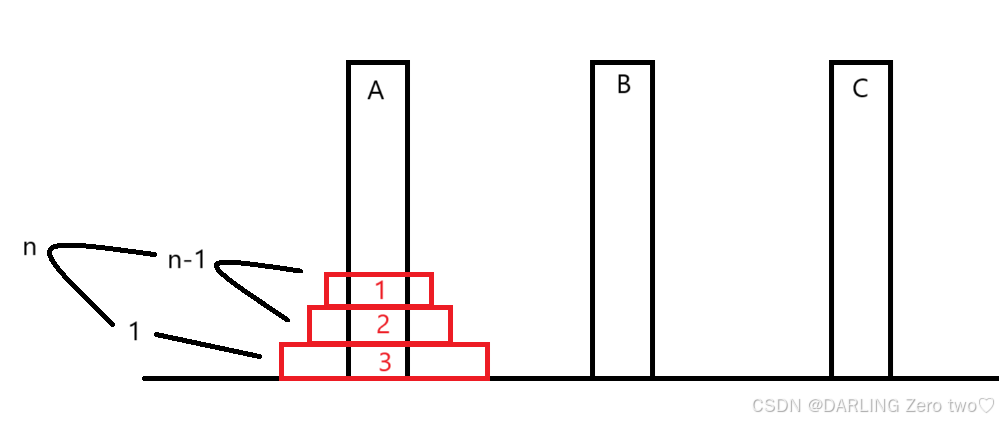 那我们梳理一下过程可知 1、首先把n-1个盘子移动到第二根中转柱B上 2、再把最后一个也就是最大的那一个盘子移动到第三根目标柱C上 3、最后再把剩下的n-1个盘子移动到第三根目标柱C上