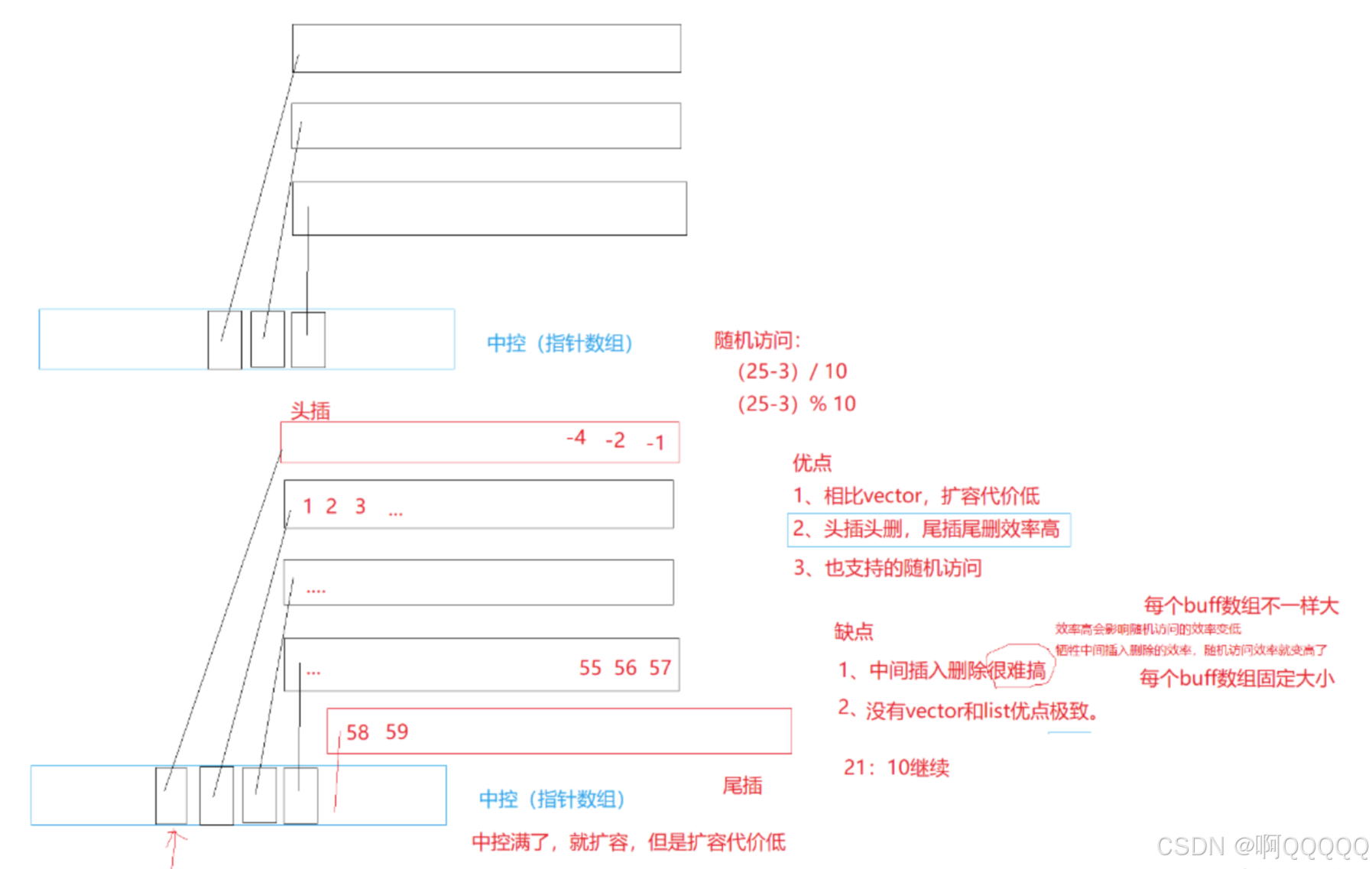 deque 并不是真正连续的空间,而是由一段段连续的小空间拼接而成的,实际 deque 类似于一个动态的二维 数组 ,其底层结构如下图所示: 解释:deque底层是一个指针数组,每一个指针指向的那个数组中的元素都是固定的,这样就形成了二维数组的结构,所以可以通过重载[]在实现随机访问,这就是弥补了list的劣势;