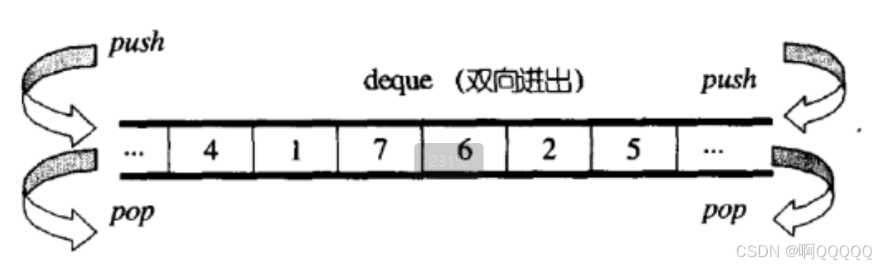 deque( 双端队列 ) :是一种双开口的 " 连续 " 空间的数据结构 ,双开口的含义是:可以在头尾两端进行插入和删除操作,且时间复杂度为O(1) ,与 vector 比较,头插效率高,不需要搬移元素;与 list 比较,空间利用率比较高。 deque就是融合了 vector和list的结合体 ,我们只要简单了解其大致原理,并不需要进行模拟实现,平时也不常用到deque;