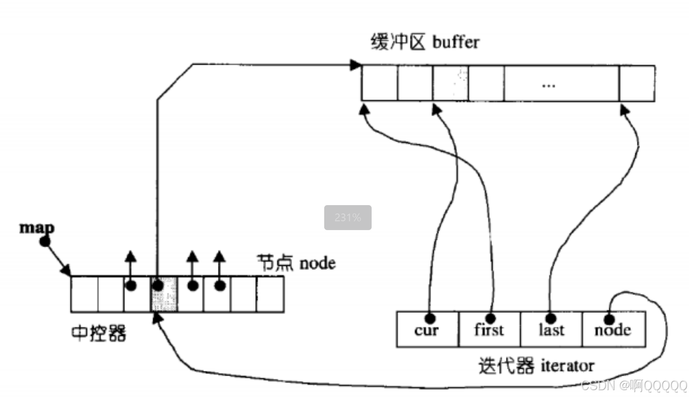 双端队列底层是一段假象的连续空间,实际是分段连续的,为了维护其 “ 整体连续 ” 以及随机访问的假象,落 在了 deque 的迭代器身上, 因此 deque 的迭代器设计就比较复杂,如下图所示: