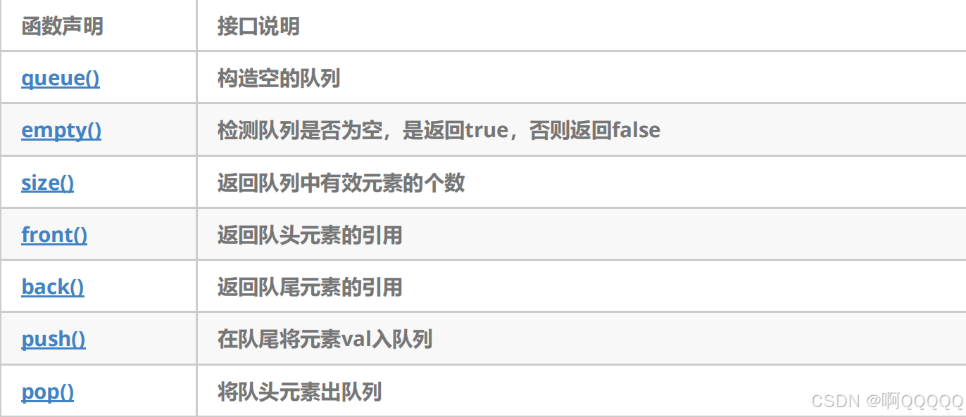 2. 队列作为容器适配器实现,容器适配器即将特定容器类封装作为其底层容器类, queue 提供一组特定的成员函数来访问其元素。 元素从队尾入队列,从队头出队列 。