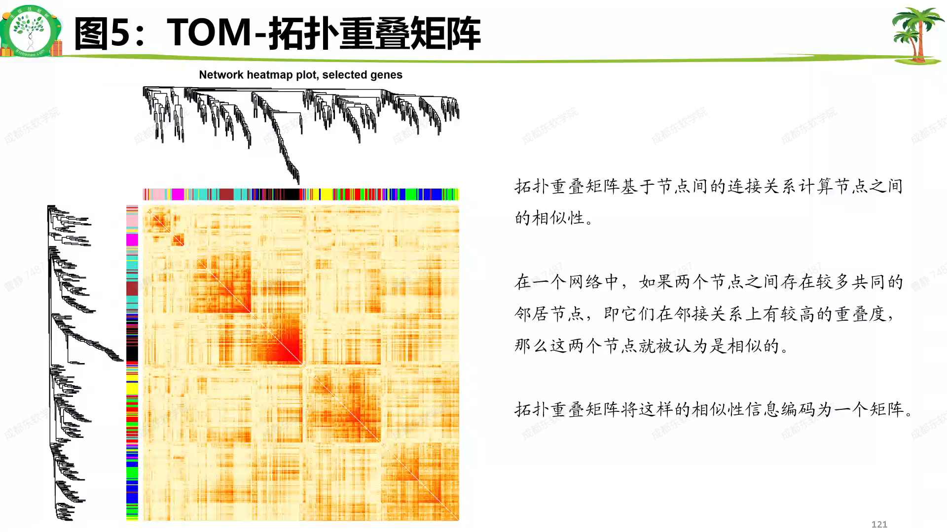 对基因进行聚类,每条线代表一个基因,相似的基因被聚到一个分支,不同模块用不同颜色表示,同一模块的基因通常具有类似的功能。