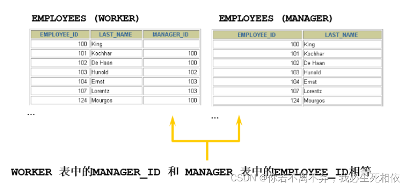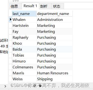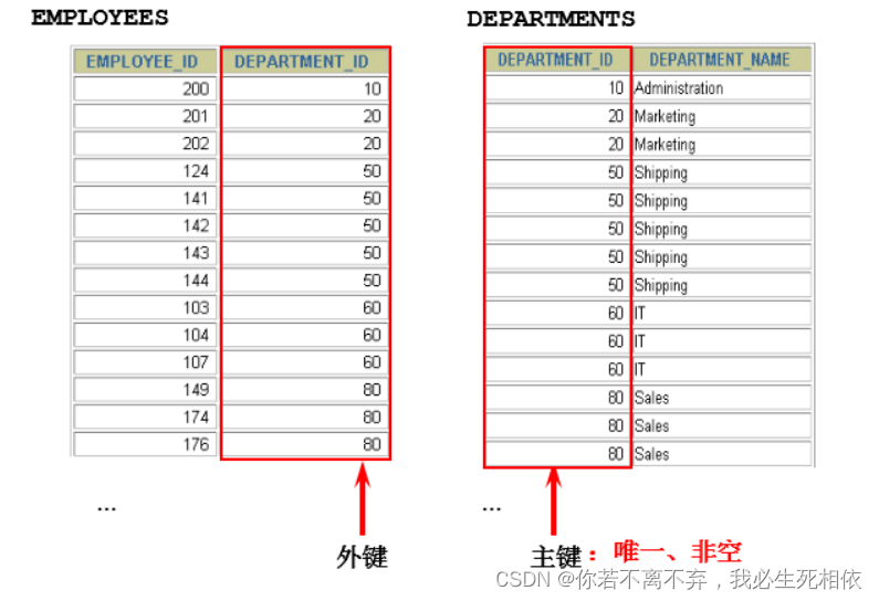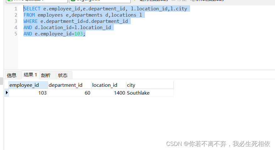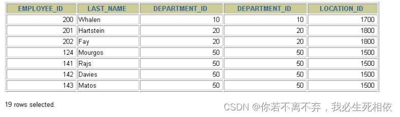 USING (department_id)你能看出与自然连接 NATURAL JOIN 不同的是,USING 指定了具体的相同的字段名称,你需要在 USING的括号 () 中填入要指定的同名字段。同时使用 JOIN…USING 可以简化 JOIN ON 的等值连接。它与下面的 SQL 查询结果是相同的: