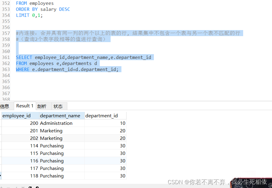 WHERE employees.department_id = departments.department_id;使用别名可以简化查询。 列名前使用表名前缀可以提高查询效率。