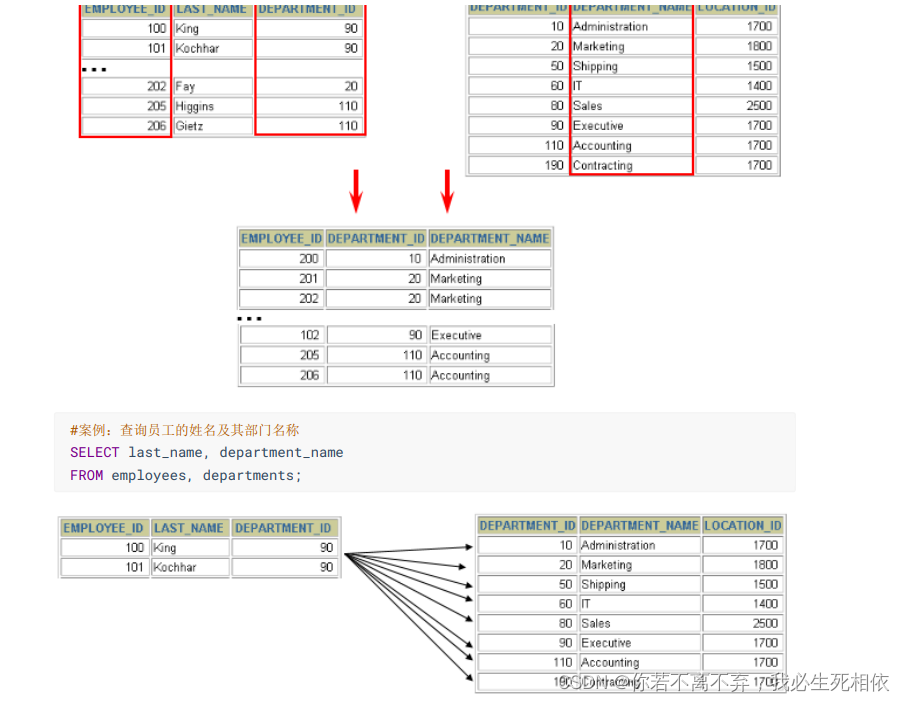 SELECT last_name,department_name FROM employees JOIN departments笛卡尔积的错误会在下面条件下产生: 省略多个表的连接条件(或关联条件) 连接条件(或关联条件)无效 所有表中的所有行互相连接