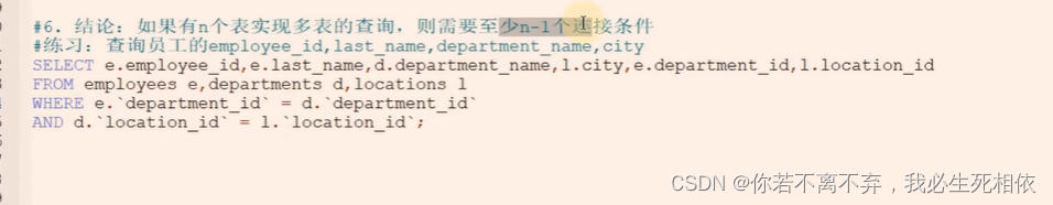 总结:连接 n个表,至少需要n-1个连接条件。比如,连接三个表,至少需要两个连接条件。 练习:查询出公司员工的 last_name,department_name, city