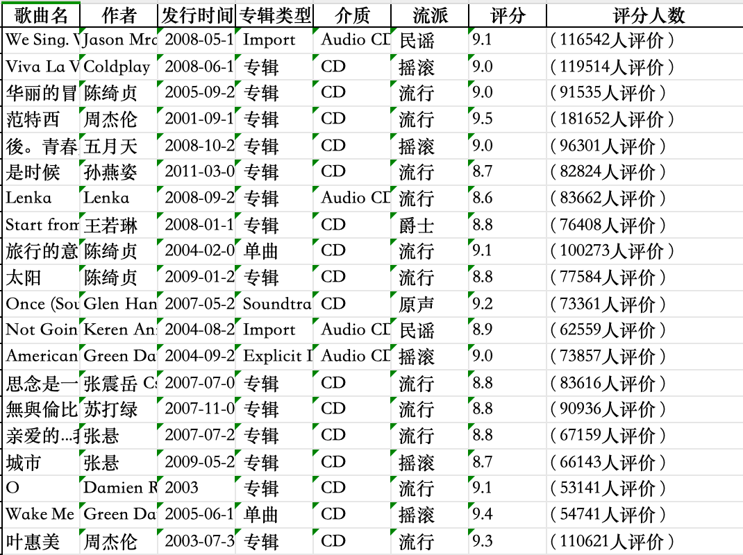 df = pd.DataFrame(data=lis,columns=['歌曲名','作者','发行时间','专辑类型','介质','流派','评分','评分人数'])