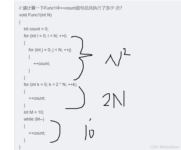 // 请计算⼀下Func1中++count语句总共执⾏了多少 次? void Func1(int N) { int count = 0; for (int i = 0; i < N; ++i) { for (int j = 0; j < N; ++j) { ++count; } } for (int k = 0; k < 2 * N; ++k) { ++count; } int M = 10; while (M--) { ++count; } }