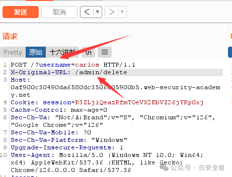其实这里的利用原理,就是将get后面的限制访问路径,放到下面的X-Original-URL头中,比如我们需要删除某个用户