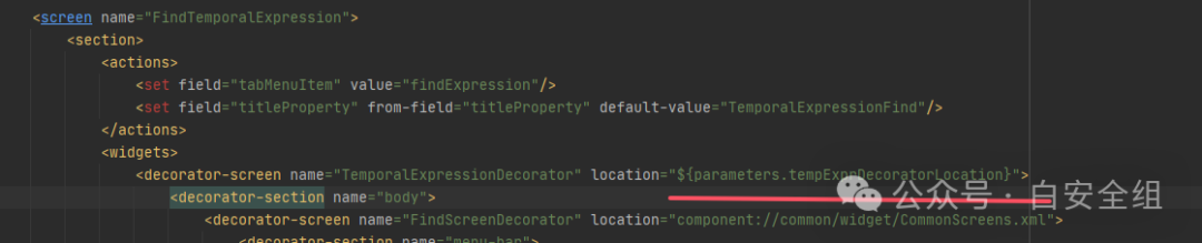 那么renderView又实现哪些功能呢。首先是renderView值在controller.xml获取xml配置,然后从xml配置文件中会指向TempExprScreens.xml这个配置文件,那么TempExprScreens.xml这个配置文件,其中涉及到findTemporalExpression的值中就包含了tempExprDecoratorLocation这个参数,类似于payload中statsDecoratorLocation参数,都可以从外部引入xml。