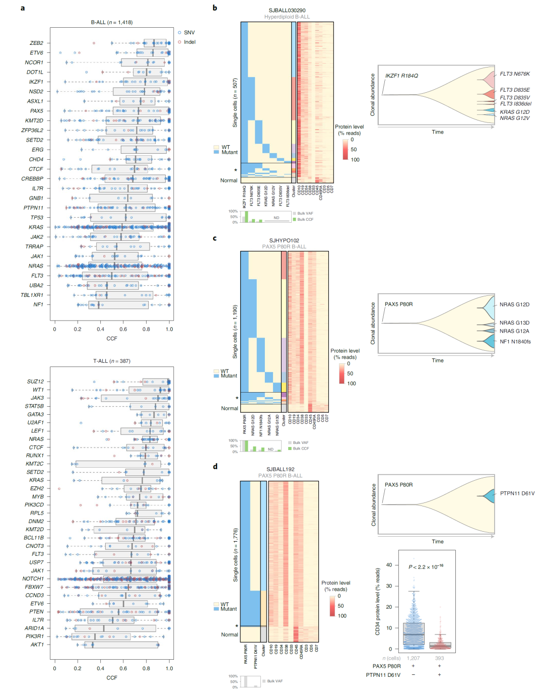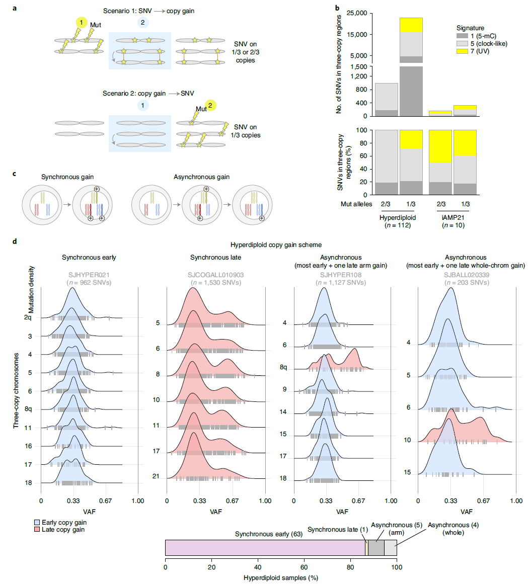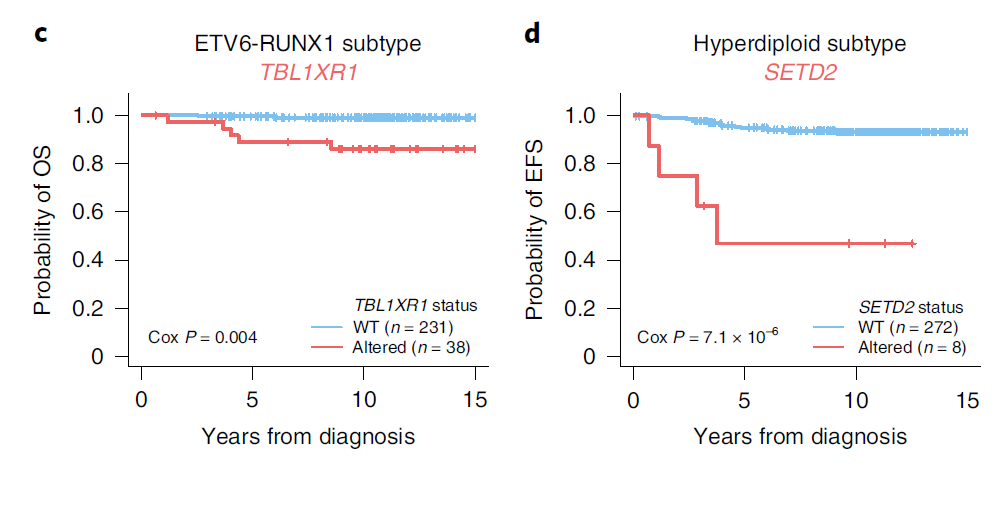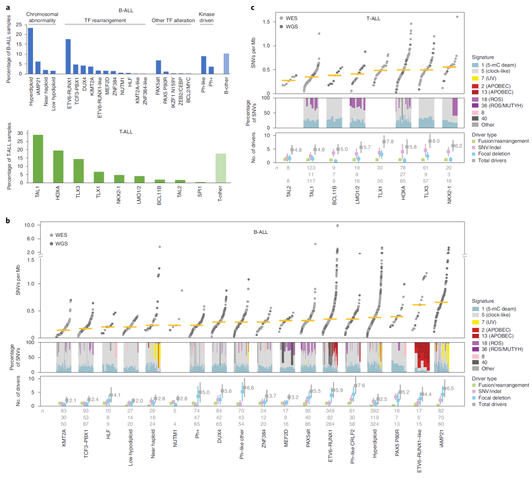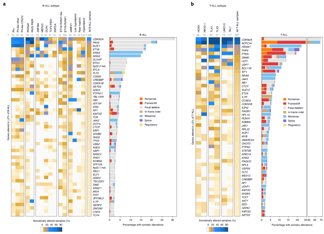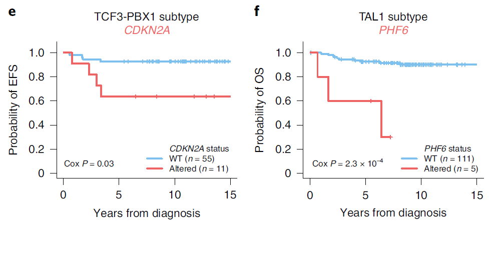 研究方法 患者和样本:2,754例新诊断的儿童和青少年ALL患者(B-ALL 2,288例,T-ALL 466例),平均诊断年龄为6.4岁。而配对的正常对照样本, 一般可以取皮肤或者口腔黏膜细胞作为正常对照、也有取毛囊作为正常对照的。在这一篇文献,研究团队则是采用缓解期的血液或骨髓,在流氏或纯化后筛选到的非肿瘤细胞。 测序方法:对1729名患者进行了全外显子测序(WES)、768名进行全基因组测序(WGS)和1808名单核苷酸多态性阵列(SNP)分析。另外还有 1889 名患者进行了单肿瘤模式的 全转录组 RNAseq。 数据处理:对于 WGS 数据,使用 BWA 比对到hg19,然后用 CONSERTING call somatic CNA ,结构变异 SV 则是采用四个工具 CREST 、SVABA、Manta、Delly进行分析,至少2个工具检测到的 SV 才会纳入后续分析。对于WES和WGS数据,SNV 和 InDel 则采用 Bambino 进行call变异,并在 BamViews 可视人工过滤,最后用 VEP 进行注释。 然后进行 SNV 突变负荷定量(TMB)和显著性突变分析(MutSigCV、GRIN、GISTIC2和MedalCeremony),还有驱动突变和突变特征分析。 这些软件我们都或多或少介绍过了哈: PyClone-vi 的使用方法--肿瘤基因组测序数据分析专栏 GISTIC2 的使用方法--肿瘤基因组测序数据分析专栏 GATK 的 germline CNV 流程--肿瘤基因组测序数据分析专栏 使用 Manta 检测结构变异--肿瘤基因组测序数据分析专栏 dbNSFP数据库--肿瘤基因组测序数据分析专栏 仅肿瘤样本的突变过滤方法--肿瘤基因组测序数据分析专栏 变异位点的描述格式--肿瘤基因组测序数据分析专栏 体细胞突变的过滤方法--肿瘤基因组测序数据分析专栏 CNVkit的使用方法--肿瘤基因组测序数据分析专栏 Strelka2 call Somatic 流程--肿瘤基因组测序数据分析专栏 GATK 的 Germline mutation 流程--肿瘤基因组测序数据分析专栏 肿瘤外显子测序数据分析公开课 Hallmarks | 癌症的特征II GATK 的Somatic Mutation流程--肿瘤基因组测序数据分析专栏 肿瘤基因组测序数据分析专栏--前言 肿瘤基因组测序数据高级分析--肿瘤基因组测序数据分析专栏 文献阅读 · 变异分析流程--肿瘤基因组测序数据分析专栏 标志| 癌症的特征 基础知识 · ClinVar--肿瘤基因组测序数据分析专栏 基础知识 · COSMIC 数据库--肿瘤基因组测序数据分析专栏 基础知识 · ExAC、GnomAD、1000G、dbSNP--肿瘤基因组测序数据分析专栏 基础知识 · 常见数据库--肿瘤基因组测序数据分析专栏 基础知识 · 全基因组测序WGS--肿瘤基因组测序数据分析专栏 基础知识 · 全外显子测序WES--肿瘤基因组测序数据分析专栏 基础知识 · 靶向测序Panel--肿瘤基因组测序数据分析专栏 研究结果 突变概况:在对所有 B-ALL 和 T-ALL 样本重新细分亚型后,B-ALL 可以分为23种不同的子亚型,而 T-ALL 则可以分为 10个子亚型(fig 1a)。 对于所有 ALL 样本来说,体细胞突变负荷是 0.35 SNVs/Mb(fig 1b & c)。并且检测到了376个驱动基因,其中70个之前未在 ALL 中被报导过。突变特征中,COSMIC 的sig1 和 sig5 几乎存在于所有样本中。 B-ALL 突变进化:hyperdiploid ALL 超二倍体白血病是儿童白血病最常见的亚型,研究团队发现,在 hyperdiploid ALL 中存在 4 种基因组倍性演化模式(fig 2c & d). 驱动突变特异性:观察到了 49 个B-ALL 亚型的特异性驱动突变基因(事件),包括6p22、ADD3、IDH1 和 SLX4IP 上的多个不同组蛋白簇缺失,而在 T-ALL 中则有 MYCN 、RPL10、FBX028 这3个特异性驱动突变基因(事件) 通路分析:基于 SNV 、Indel 和 CNA 来观察受影响的生物通路,发现转录因子和表观遗传调节因子的改变在 B-ALL 和 T-ALL 中都很常见。 驱动突变的克隆性:在 B-ALL 亚型中,驱动突变(ETV6、IKZF1 和 PAX5)的癌细胞分数(携带突变的肿瘤细胞的百分比,或癌细胞分数 (CCF))很高,表明早期发生,而激酶信号点突变(KRAS、NRAS、JAK1、JAK2、FLT3 等)通常是亚克隆的,表明进化发生较晚。在 T-ALL 中,某些激酶相关的改变具有较高的 CCF,包括 JAK3 和 NRAS(fig 4a) 生存分析:在 B-ALL 中,与 IKZF1 缺失患者相比,IKZF1 的预后较差。与特定 B-ALL 亚型的较差结果相关的突变包括 ETV6-RUNX1 ALL 中的 TBL1XR1、超二倍体 ALL 中的 SETD2 和 TCF3-PBX1 ALL 中的 CDKN2A(fig 6c-e)。在 T-ALL 中,PHF6 的改变与 TAL1 亚型的较差 OS 相关(图 6f)。 总结 本研究揭示了多种遗传变异对 ALL 发展的影响,同时加深了对ALL基因组景观和相关预后的理解,为未来的精准医疗提供了潜在的靶点。有助于开发针对特定遗传变异的新型治疗策略。同时该研究也存在一定的局限性,如研究主要关注了儿童和青少年患者,对于成人患者的适用性可能有限,研究结果需要在更大的患者群体中进一步验证。